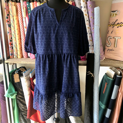 You'll need from 2 to 3.5 metres of fabric, depending on the size & options that you choose. The fabric suggestions for this are drapey fabrics, such as cotton, silk or viscose. I made mine in a Broderie Anglaise which we have in 2 colourways: Black or Pale Blue.
