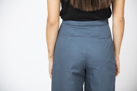 The wide leg pants are high-waisted with a fly front, curved front slash pockets, a shaped waistband & darts in the back. They're drafted to be fitted around the waist & hip before dropping into a wide, slightly cropped leg.