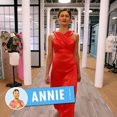 Even though this was a challenge for woven fabrics, Cristian mysteriously decided to choose a fabric with lycra in it, which was a novel take on the challenge. He used a stretch velvet to make a dress which I have actually made for myself for a bridesmaid's dress for my BFF's wedding! I had the sense though to not make "so many changes to the pattern" as admitted by Cristian. That's the kiss of death on this programme! Stick to the script, Cristian!!