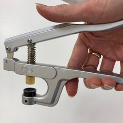 - Make sure that your pliers are the correct way around. Insert your fabric into the pliers. For the Kam tool in the demonstration, the cap is placed at the bottom inside the die & the rubber head is pressed down onto the socket - the trick is to ensure that everything is perfectly aligned.
