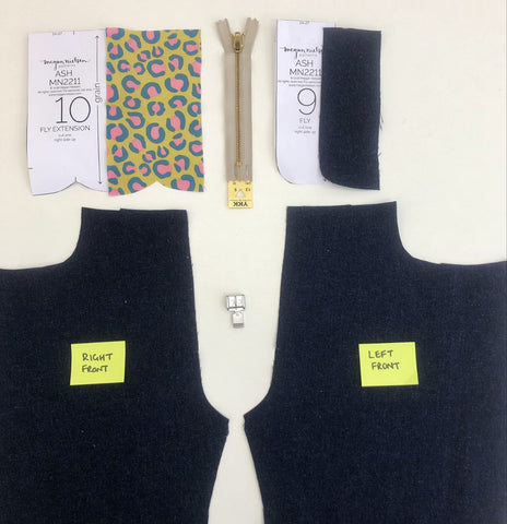You will need both Front pattern pieces of your garment, the Fly & the Fly Extension (sometimes referred to as the shield), along with the correct sized zip (8" in this case) & a zipper foot.