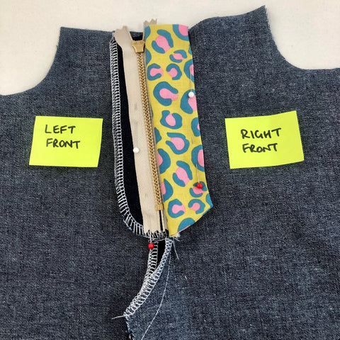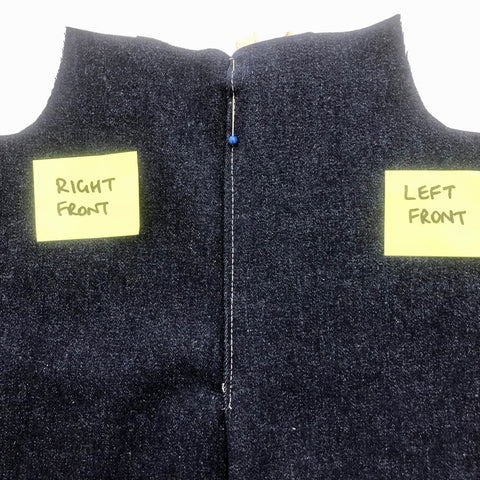 - Flip over to the front & you should find that left front sits nicely over the Right front, covering the zip & the topstitching on the Right front. Put a pin in the top to secure the position. (If you have notches for centre seams the folded left front should align with the notch for the right centre seam)